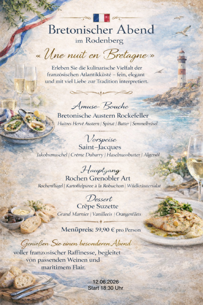 Genießen Sie ein 4-Gang-Menü der bretonischen Küche – mit frischen Meeresfrüchten und französischen Aromen.