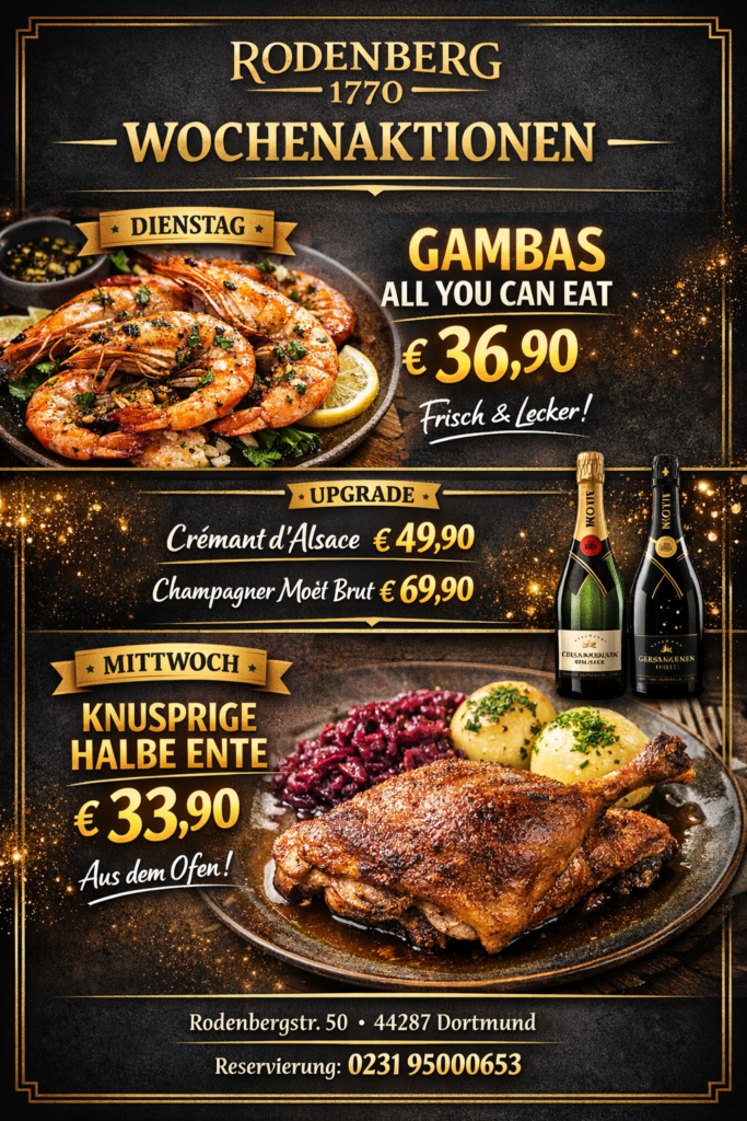 Mittwoch servieren Ihnen unsere knusprige halbe Ente aus dem Ofen – außen goldbraun, innen saftig. Für 33,90€