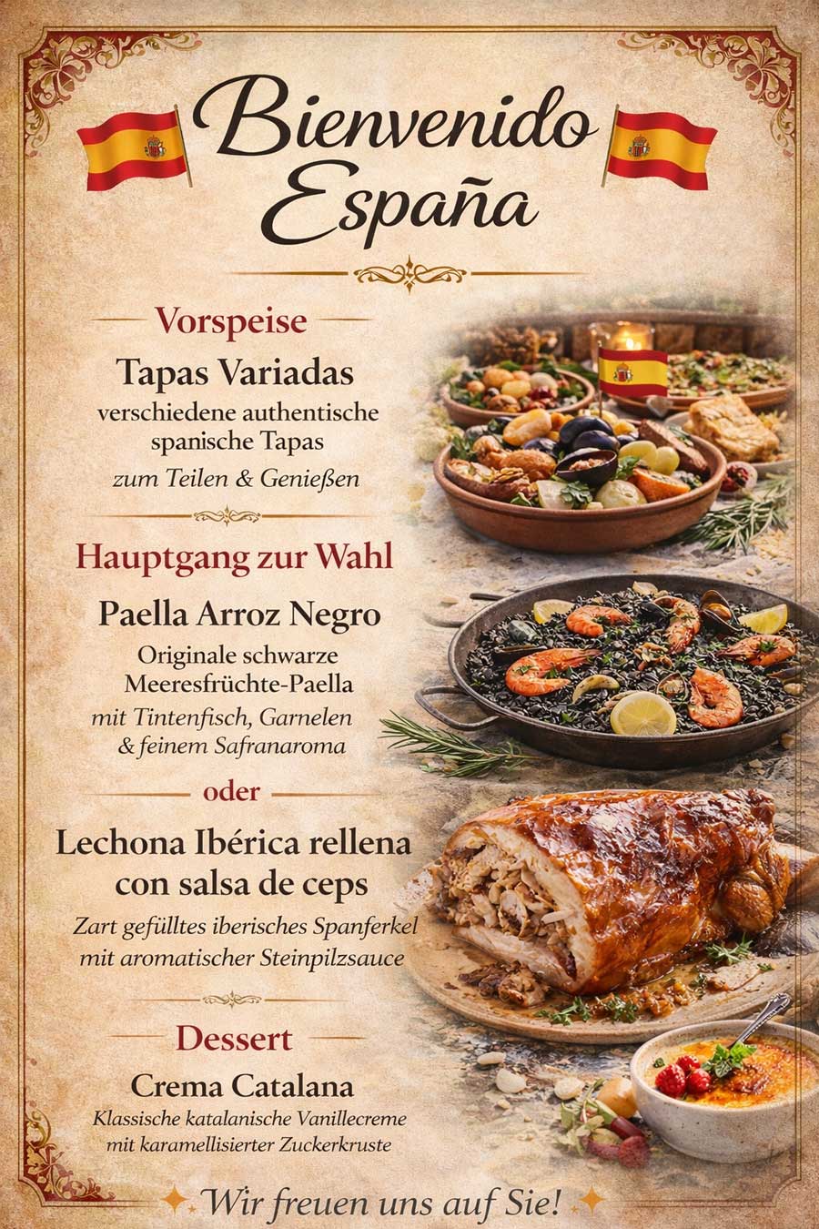 Unser spanischer Koch aus Barcelona verzaubert Sie mit einem Menü aus köstlichen einheimischen Speisen von der Iberischen Halbinsel.
